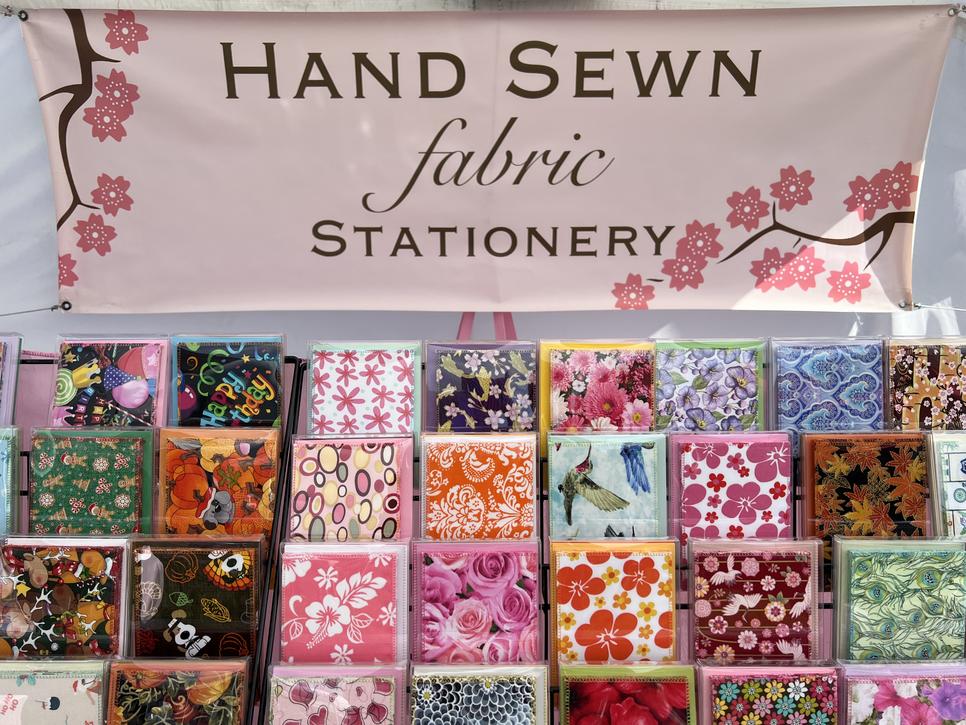 I have a line of Handsewn Fabric Stationery that I make 100% myself at my home in Hollywood, California. I sew fabric to paper to create a very unique line of notecards. There are hundreds of themed fabrics in my booth at every show!